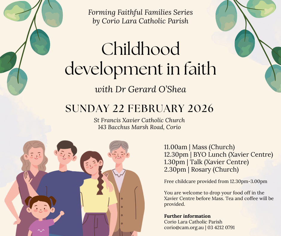 FORMING FAITHFUL FAMILIES: CHILDHOOD DEVELOPMENT IN FAITH. Parish families are invited to come together for an afternoon of prayer, fellowship and formation on Sunday 22nd February. Begins with BYO lunch at 12.30pm in the Xavier Centre. At 1.30pm, former principal and RE curriculum writer Dr Gerard O’Shea will speak about the stages of childhood development in faith. We will close with the rosary at 2:30pm. Free childcare available.